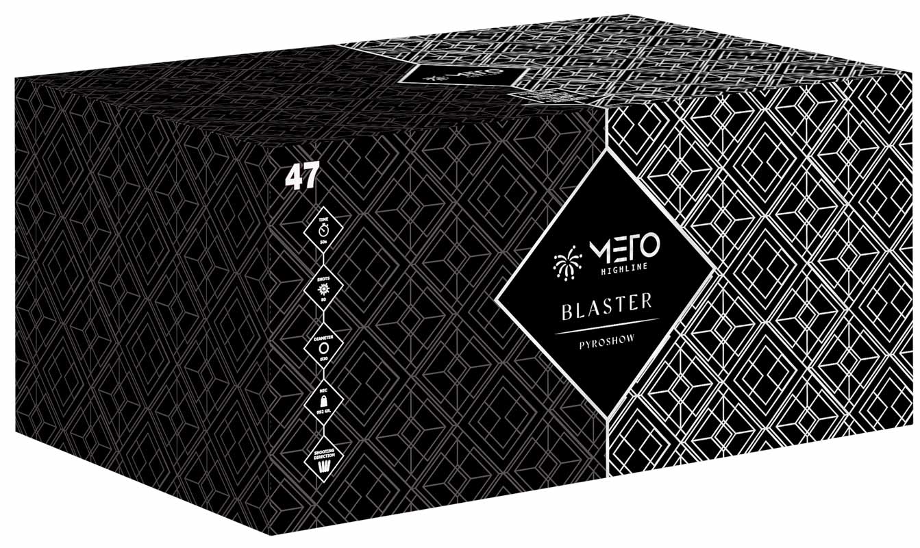 Meto Blaster er et imponerende compound batteri med 80 skud i 25–30 mm kaliber. Med en krudtmængde på 986 gram leverer det et varieret show med effekter i guld, gul, lilla samt hvid og rød strobe. Et batteri designet til at skabe en spektakulær oplevelse, der gør nytårsaften uforglemmelig.