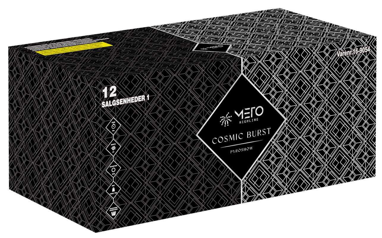 Cosmic Burst kombinerer lodrette skud med brede vifteaffyringer, hvilket skaber et dynamisk og levende show på himlen. Hvert skud indeholder 21,9 gram krudt og er udstyret med kraftige mine-effekter, så eksplosionen starter helt fra bunden. Farver, tempo og slagkraft er i top, og helheden giver et massivt og professionelt udtryk, der uden tvivl imponerer både familie og nabolag.