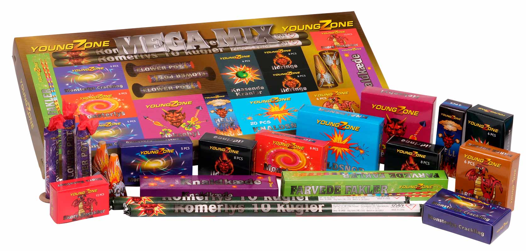 Young Zone MEGA Mix til junior. En fyrværkeri pakke der giver underholdning til hele aftenen med masser af sjovt indhold